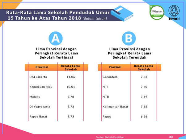 Jika melihat kembali data GTCI di atas, ada korelasi antara lama sekolah yang ditempuh penduduk dengan kualitas talenta sumber daya negara tersebut. Bila diperhatikan, Singapura, Malaysia, Brunei, dan Filipina berulang kali menempati lima posisi teratas di Asean. Dalam hal ini, Indonesia bahkan masih tertinggal dari Malaysia dan Filipina. Meski demikian, ada peningkatan rata-rata lama sekolah di Indonesia dari tahun ke tahun. Rata-rata lama sekolah menunjukkan jenjang pendidikan yang pernah/sedang diduduki oleh seseorang. Semakin tinggi angka rata-rata lama sekolah, semakin lama/tinggi jenjang pendidikan yang ditamatkannya. Bersumber dari Statistik Pendidikan, pada 2015 misalnya, rerata lama sekolahnya adalah 8,32 tahun. Rerata tersebut naik pada 2016 menjadi 8,42 dan naik kembali pada 2017, yaitu 8,5 tahun. Pada 2018, rerata lama ekolah di Indonesia mencapai 8,58 tahun atau setara dengan kelas 2 SMP/sederajat. Sayangnya, angka rata-rata lama sekolah pada 2018 belum memenuhi target Renstra Kemendikbud sebesar 8,7 tahun. Selain itu, target RPJMN tahun 2019 pun tak terpenuhi: rata-rata lama sekolah penduduk 15 tahun ke atas sebesar 8,8 tahun. Bila dilihat berdasarkan provinsi, DKI Jakarta menempati peringkat tertinggi dengan rata-rata lama sekolah 11,06 tahun, disusul Kepulauan Riau (10,01 tahun), dan Maluku (9,78 tahun). Sementara itu, provinsi dengan peringkat rata-rata lama sekolah paling rendah adalah Papua (6,66 tahun), Kalimantan Barat (7,65 tahun), dan NTB (7,69 tahun).