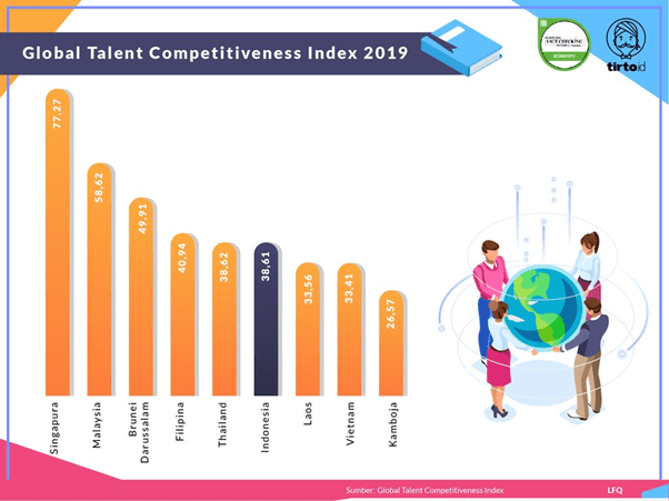 Lemahnya Daya Saing IndonesiaGlobal Talent Competitiveness Index (GTCI) (PDF) adalah pemeringkatan daya saing negara berdasarkan kemampuan atau talenta sumber daya manusia yang dimiliki negara tersebut. Beberapa indikator penilaian indeks ini adalah pendapatan per kapita, pendidikan, infrastruktur teknologi komputer informasi, gender, lingkungan, tingkat toleransi, hingga stabilitas politik. Di ASEAN, Singapura menempati peringkat pertama dengan skor 77,27. Peringkat berikutnya disusul oleh Malaysia (58,62), Brunei Darussalam (49,91), dan Filipina (40,94). Sementara itu, Indonesia ada di posisi ke enam dengan skor sebesar 38,61.