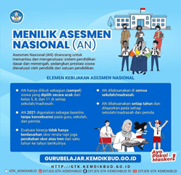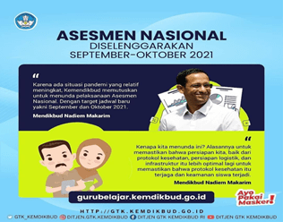 Menteri Pendidikan dan Kebudayaan Nadiem Anwar Makarim memutuskan perihal kebijakan pelaksanaan Asesmen Nasional (AN) tahun 2021. Asesmen Nasional yang rencananya akan diselenggarakan mulai Maret 2021, diundur menjadi September s.d. Oktober 2021. Hal tersebut diungkapkan Mendikbud dalam rapat kerja dengan Komisi X DPR RI secara virtual, pada Rabu (20/1/2021). “AN tetap perlu dilaksanakan. Kalau tidak, kita tidak bisa menghitung learning loss dan mengetahui mana saja sekolah-sekolah yang paling membutuhkan bantuan kita. Inilah yang diinginkan Kemendikbud dan DPR,” jelas Mendikbud pada raker di Jakarta, Rabu (20/1), yang membahas beberapa isu strategis Kementerian Pendidikan dan Kebudayaan (Kemendikbud)