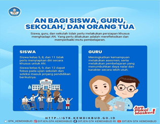 SISWA: siswa kelas 5,8,11 tidak perlu menyiapkan diri secara khusus untuk AN serta siswa kelas 6,9.12 dapat fokus pada ujian sekolah dan seleksi masuk jenjang pendidikan berikutnya.