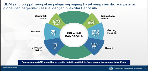 “Beriman dan bertakwa kepada Tuhan YME serta berakhlak mulia, berkebhinekaan global, mandiri, bergotong royong, bernalar kritis, dan kreatif,” kata Mendikbud.